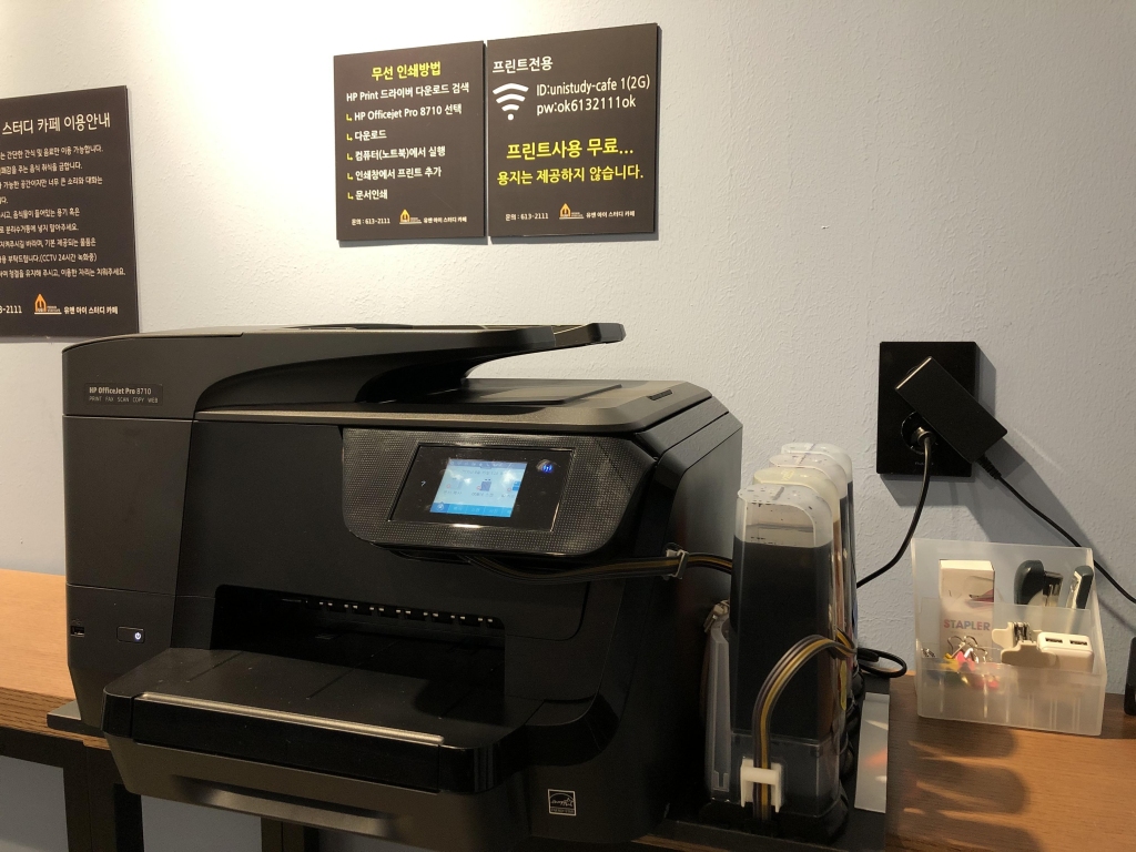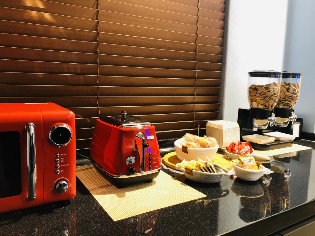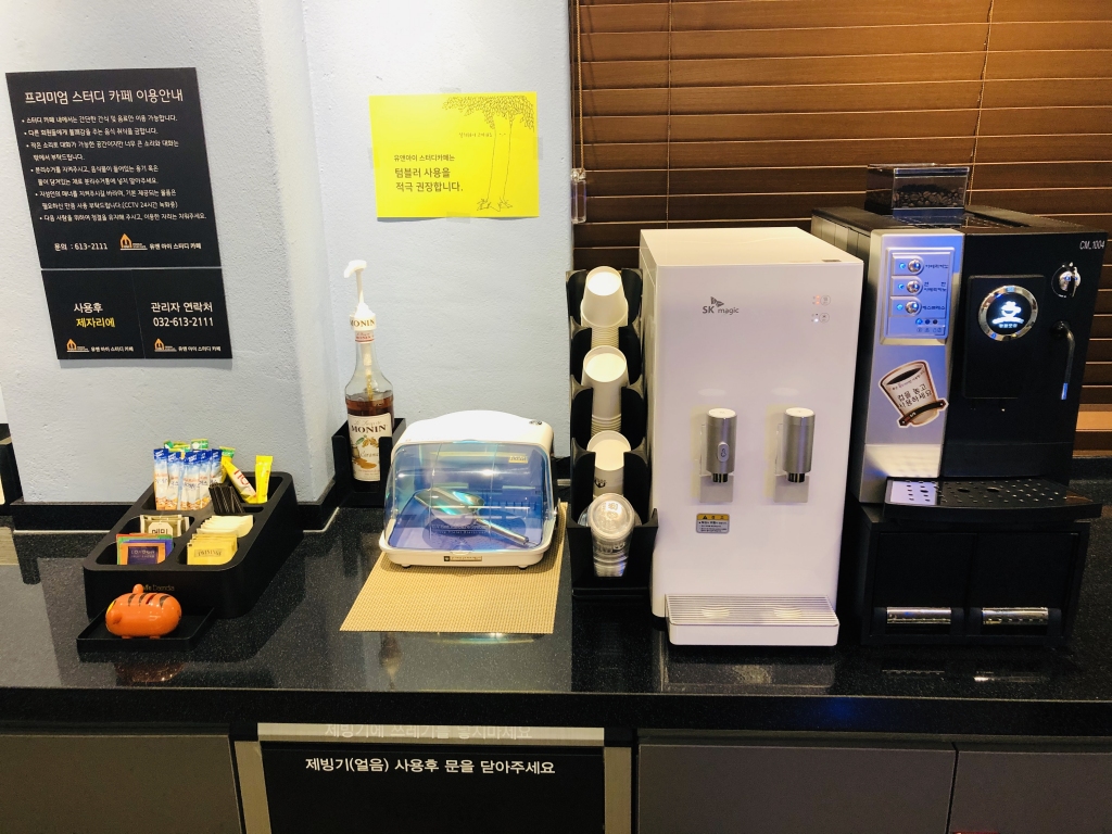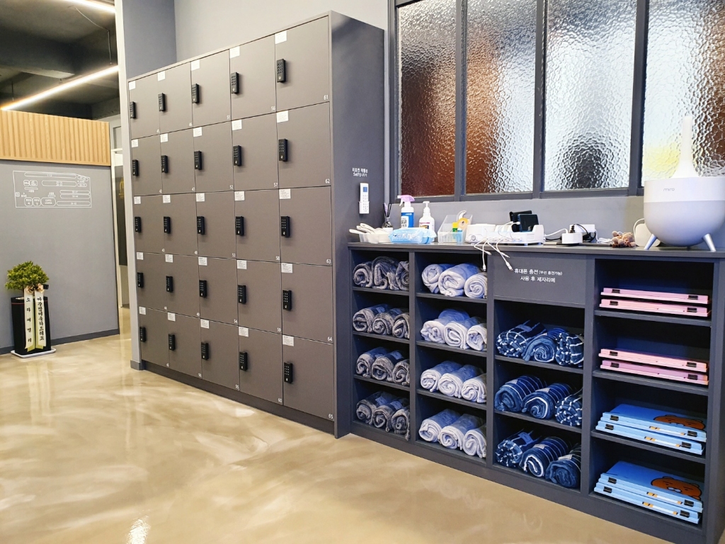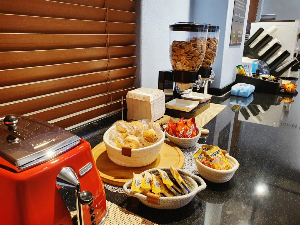 휴게실 공간 넓게 마련하여 커피, 음료수, 과자를 무료로 제공하고 있으며, 프린트기, 거치대, 담요, 충전기 등도 준비되어 있습니다.