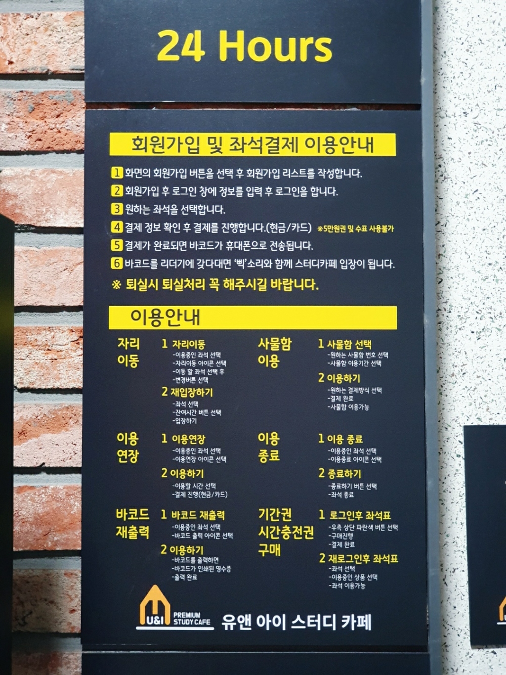 키오스크가 설치된 입구에는 회원가입 및 좌석 결제 이용안내가 게시되어 있습니다.