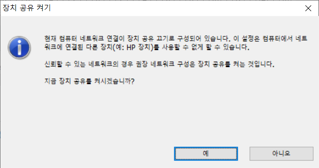 장치 공유를 켜야 무선으로 인쇄할 수 있습니다! "예"를 눌러 공유를 켜주세요.